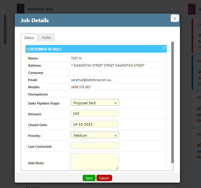 The Sales Pipeline management screen is used to track and manage the progress of Sales Leads. All jobs in a Sales Pipeline will be listed in a column corresponding to their Sales Pipeline Stage.
