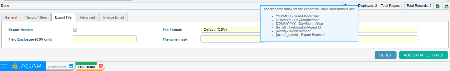 | Filename mask | A file name for the export, can use variables like appointment number or job number |