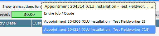 - Select from the dropdown an installation appointment; if the dropdown is not visible then transactions are recorded against the quote/job.