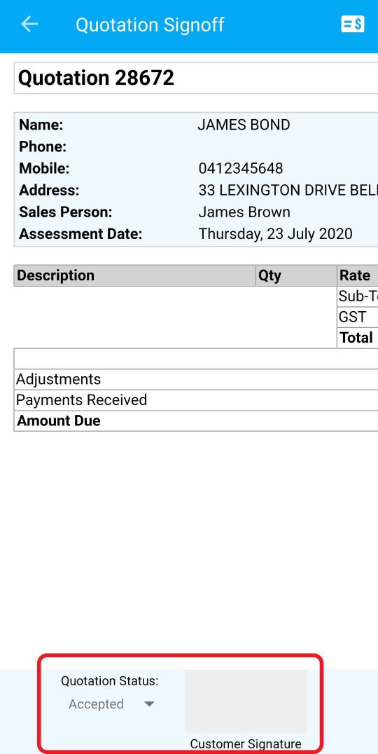 Note: The Quotation status must be selected as Accepted before the ‘Customer Signature’ feature becomes available to sign.